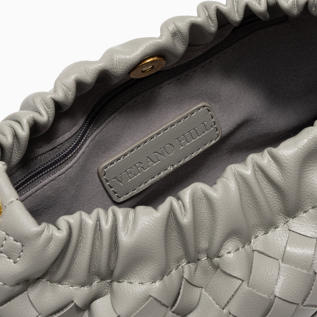 Wykonana w miękkiej sylwetce o efekcie chmury i zrobiona z wysokiej jakości wegańskiej skóry, jest lekka, ale elegancka. Jej wyrafinowana struktura pomieści wszystko, co niezbędne, podczas gdy złota pleciona ramiączka dodaje blasku i kobiecości każdemu strojowi.