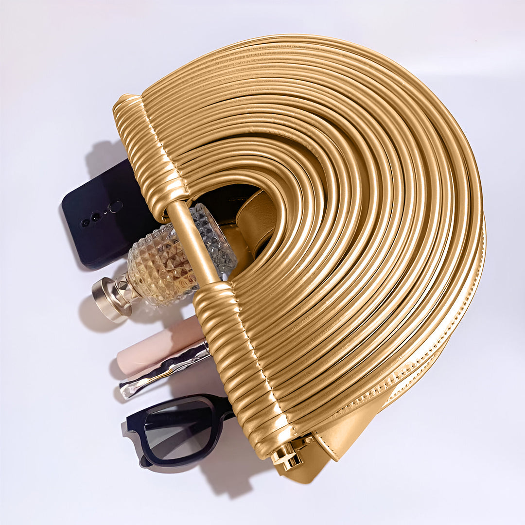 Jej charakterystyczna półokrągła sylwetka i błyszczące metaliczne wykończenie przyciągają wzrok zdecydowaną elegancją, czyniąc ją idealną zarówno na codzienną finezję, jak i na urokliwe wieczory specjalne. Odpinany pasek na ramię i wbudowany uchwyt oferują bezwysiłkową wszechstronność, dostosowując się z wdziękiem do każdej okazji.