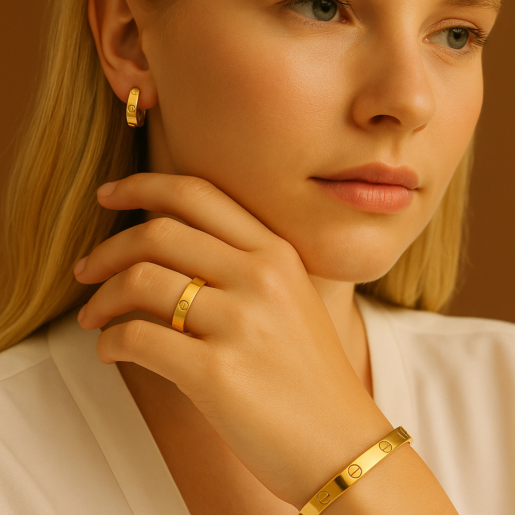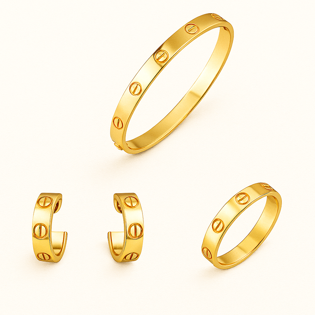 Mocny, minimalistyczny zestaw składający się z bransoletki, kolczyków i pierścionka – każdy z rozpoznawalnymi detalami w formie śrub, które emanują ponadczasową klasą. Ta ikoniczna kombinacja symbolizuje czystą elegancję i nowoczesny design, idealna dla tych, którzy cenią subtelną luksus i wyrafinowanie w każdym ruchu.